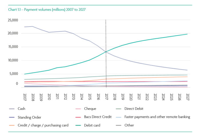 Towards the end of 2017 in the UK the use of cash as the primary way to complete such exchanges was replaced by the use of debit cards (UK Finances). There were 13.2 billion debit card payments in 2017, an increase of 14% on the previous year, with the use of cash continuing to decline in 2017, falling by 15% to 13.1 billion payments (34% of all payments). The vast majority of the population (98%) now hold a debit card and most people use them to make day-to-day payments, and increasingly this has been through contactless payment. In contrast, although most people continue to have access to cash the use of notes and coins to make payments was dropped steadily. Whilst in 2017 it represented 1 in 3 transactions, a decade earlier case has accounted for 61% of all payments.