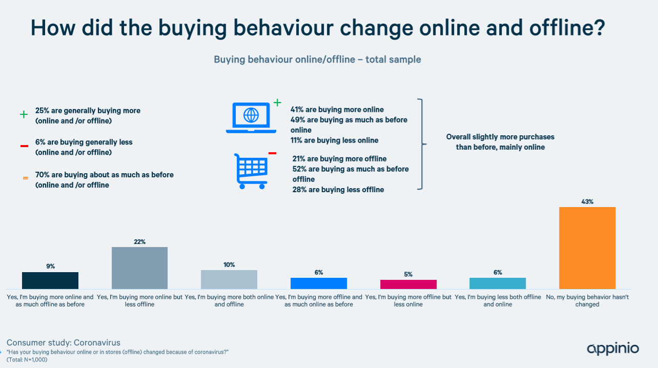 We will continue to monitor this pattern over the coming months, and explore how such shifts in behavior may have implications for supply chains (including the extension of more delivery options needed) and changes in demand (surely the demand for toilet paper must eventually plateau?). But the Appinio data underlines that, to date, no simple pattern is emerging about a rush to online shopping to replace in-shop activity, or that the current shifts in retail behavior represent a longer-term, more deep-seated transition to online retailing.